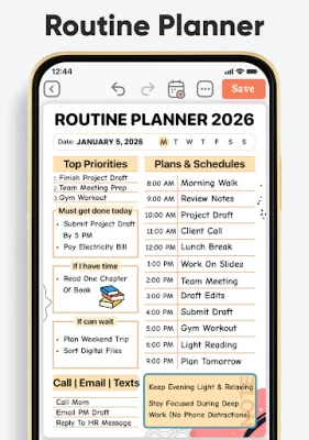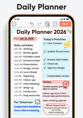 Jeste li spremni preuzeti potpunu kontrolu nad svojim vremenom i ciljevima? Predstavljamo Daily Planner & Weekly Planner, vašeg sveobuhvatnog digitalnog suputnika za organizaciju života, od svakodnevnih obveza do dugoročnih aspiracija. Dizajniran da vam pruži jasnoću i fokus, Daily Planner & Weekly Planner transformira kaos u red, omogućujući vam da s lakoćom planirate, pratite i ostvarujete sve što vam je važno. Bilo da se radi o poslovnim zadacima, osobnim ciljevima ili jednostavno želji za boljom rutinom, ova aplikacija je ključ za vašu produktivnost i mentalni mir.