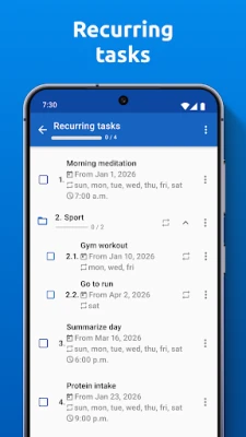 Nadalje, To-Do List App - Daily Planner nudi alate za praćenje napretka, pomažući vam da razbijete veće ciljeve u manje, ostvarive korake i vizualizirate svoj put do uspjeha. Pratite završetak zadataka bez napora i ostanite motivirani dok svladavate svoje obveze. Vaši su podaci sigurni i pouzdani, uz automatsko stvaranje sigurnosnih kopija, tako da se možete potpuno posvetiti svojim dnevnim rutinama bez brige o gubitku informacija. Prepustite se novoj razini organizacije i produktivnosti uz ovaj elegantan i moćan alat koji je osmišljen da pojednostavi svaki aspekt vašeg planiranja.