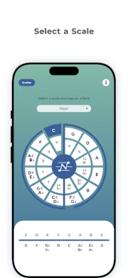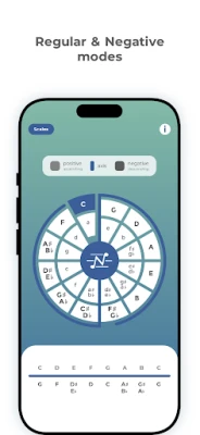 Srce aplikacije leži u njenoj sposobnosti da precizno prikaže note unutar odabrane ljestvice ili modusa, zajedno s njihovim relativnim negativnim harmonijskim parnjacima. Na početnoj stranici, posvećenoj ljestvicama, korisnik bira ljestvicu ili modus te dodiruje željeni ton unutar vizualnog kvintnog kruga. Aplikacija zatim ističe odabrani ton, prikazuje sve pripadajuće note ljestvice i njihove negativne harmonijske inačice, te uz pomoć plave osi jasno ilustrira teorijsku pozadinu odnosa unutar glazbenog prostora. Dijatonska detekcija nota osigurava da odmah prepoznate tonove koji ne pripadaju odabranoj strukturi, a zvučni primjeri dodatno obogaćuju razumijevanje.