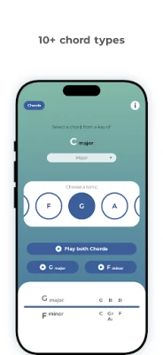 Nakon uspostavljanja tonskog centra i ljestvice, druga stranica posvećena akordima otvara se za daljnje istraživanje. Ovdje možete birati između raznih vrsta akorada – dur, mol, suspendirani, augmentirani i mnogi drugi – te odabrati notu iz prethodno postavljene ljestvice. Trenutno se prikazuju naziv odabranog akorda, njegove sastavne note, kao i naziv pripadajućeg negativnog harmonijskog akorda s njegovim notama. Crvena boja na notama jasno signalizira one koje su nedijatonske, odnosno izvan konteksta odabrane ljestvice, pružajući neprocjenjiv uvid u harmonijsku strukturu i potencijalna proširenja. Svaki akord dolazi sa zvučnim primjerima, i pozitivnim i negativnim, za dublje auditivno iskustvo.